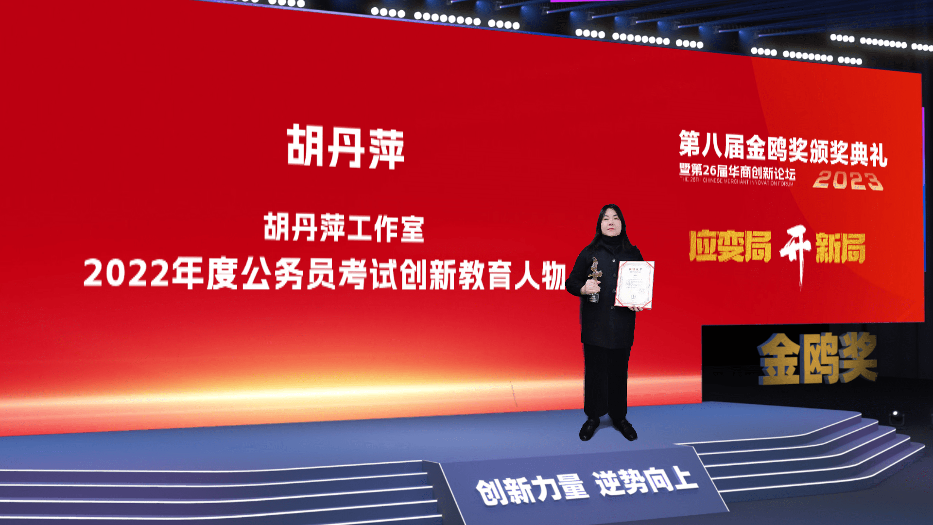 第八届金鸥奖云盛典活动上播放了2022年度金鸥奖获奖名单,其中东方甄选创始人俞敏洪等企业家荣获2022年度创业人物、理想汽车等企业荣获2022年度行业影响力企业、新浪财经CEO邓庆旭等职业经理人荣获2022年度创新人物奖。胡丹萍也在本届金鸥奖获奖名单之列,荣获2022年度公务员考试创新教育人物奖项。