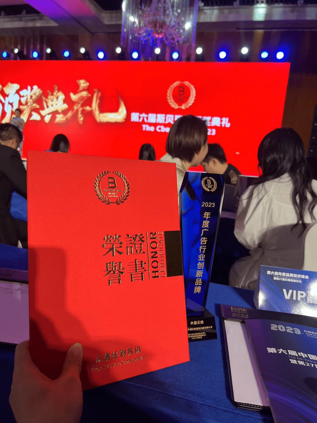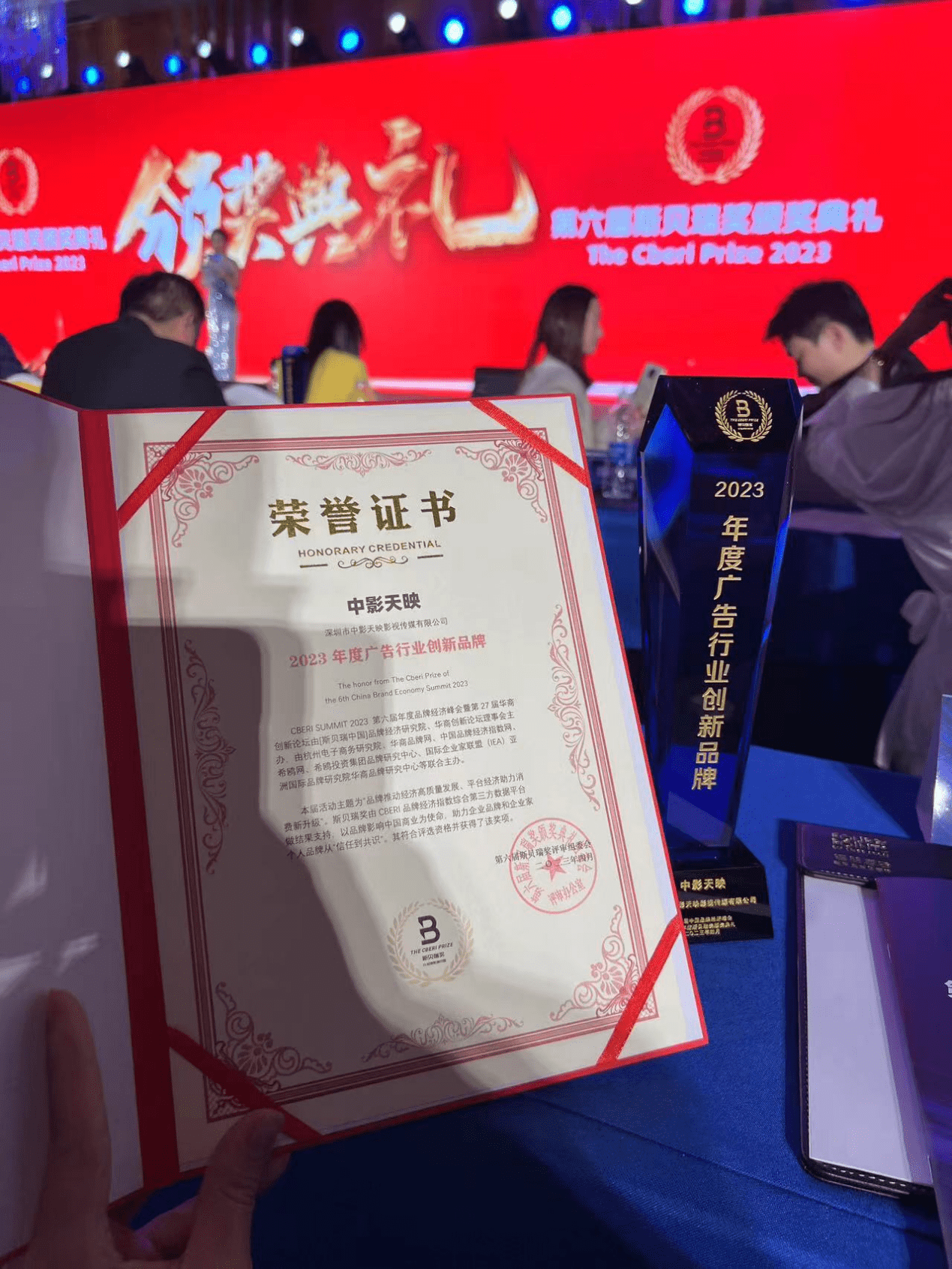在晚上第27届华商创新论坛“杭州之夜”VIP交流活动开始之前,本次峰会还在现场揭晓了2023年度斯贝瑞奖评选结果。其中,中影天映荣获了“2023年度广告行业创新品牌”。