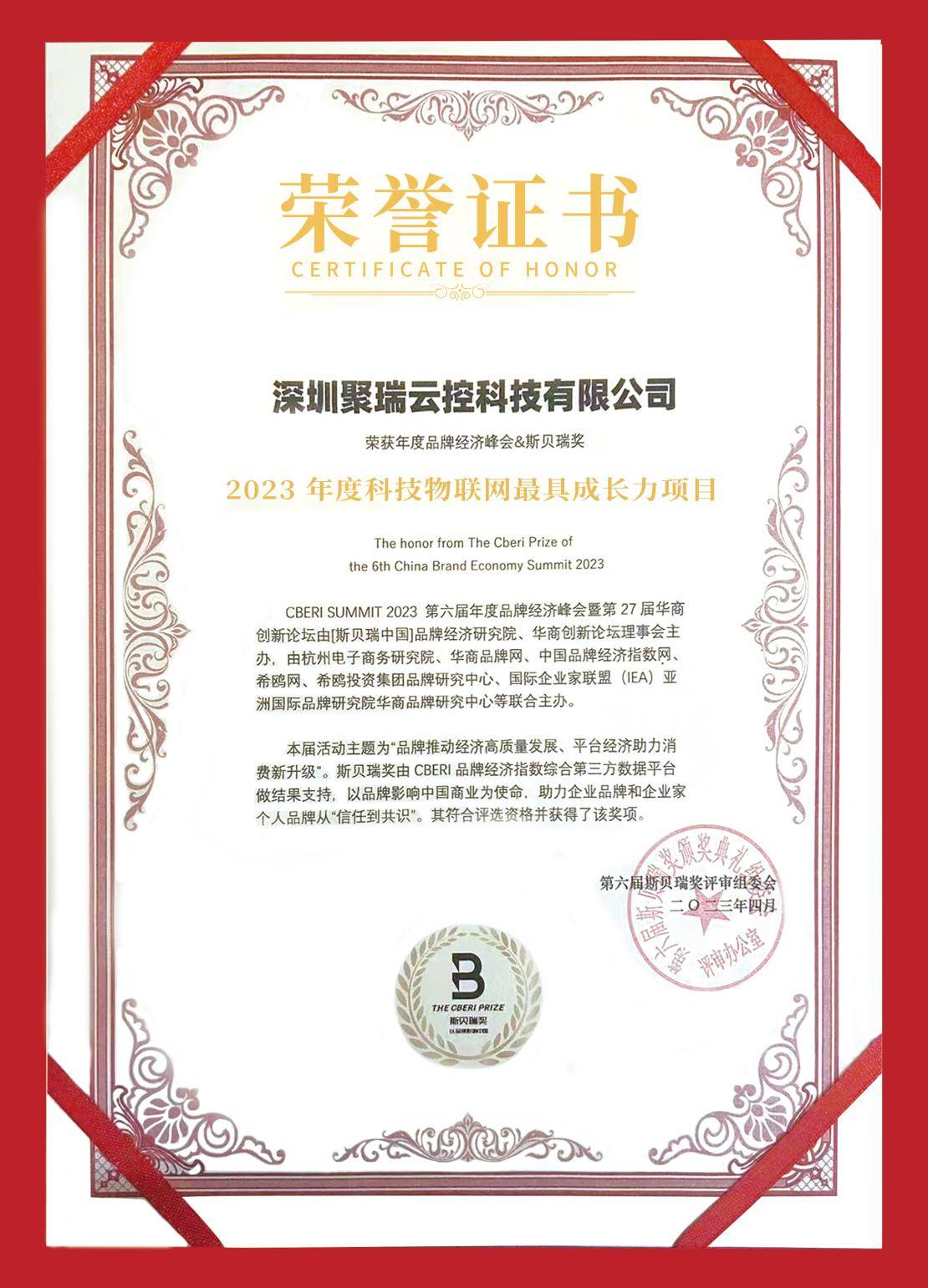 在晚上第27届华商创新论坛“杭州之夜”VIP交流活动开始之前,本次峰会还在现场揭晓了2023年度斯贝瑞奖评选结果。其中,深圳聚瑞云控科技有限公司荣获了2023年度科技物联网最具成长力项目。