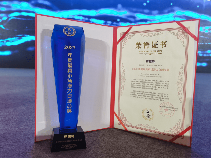 在晚上第27届华商创新论坛“杭州之夜”VIP交流活动开始之前,本次峰会还在现场揭晓了2023年度斯贝瑞奖评选结果。其中,黔粮樽荣获斯贝瑞奖2023年度最具市场潜力白酒品牌。