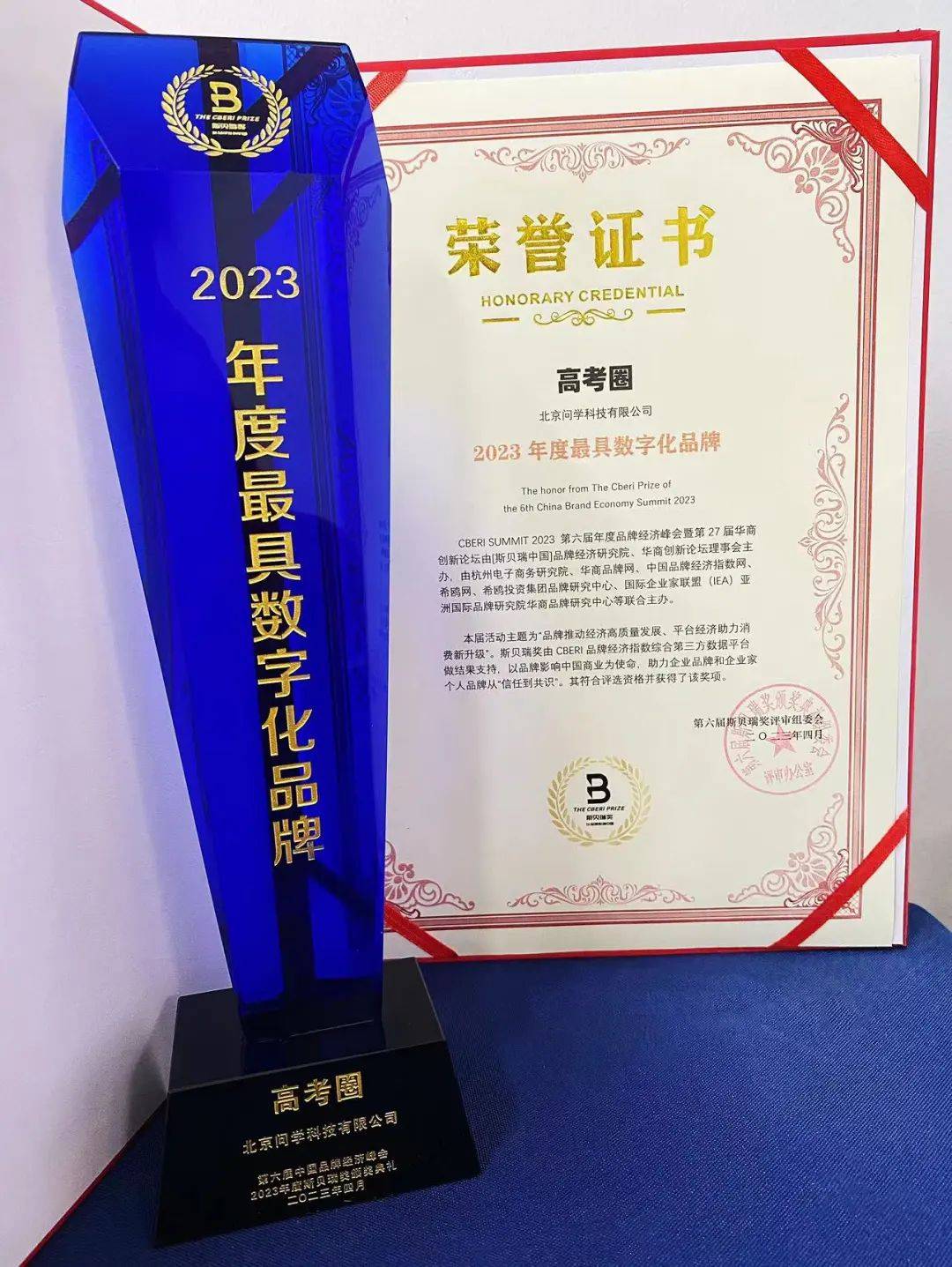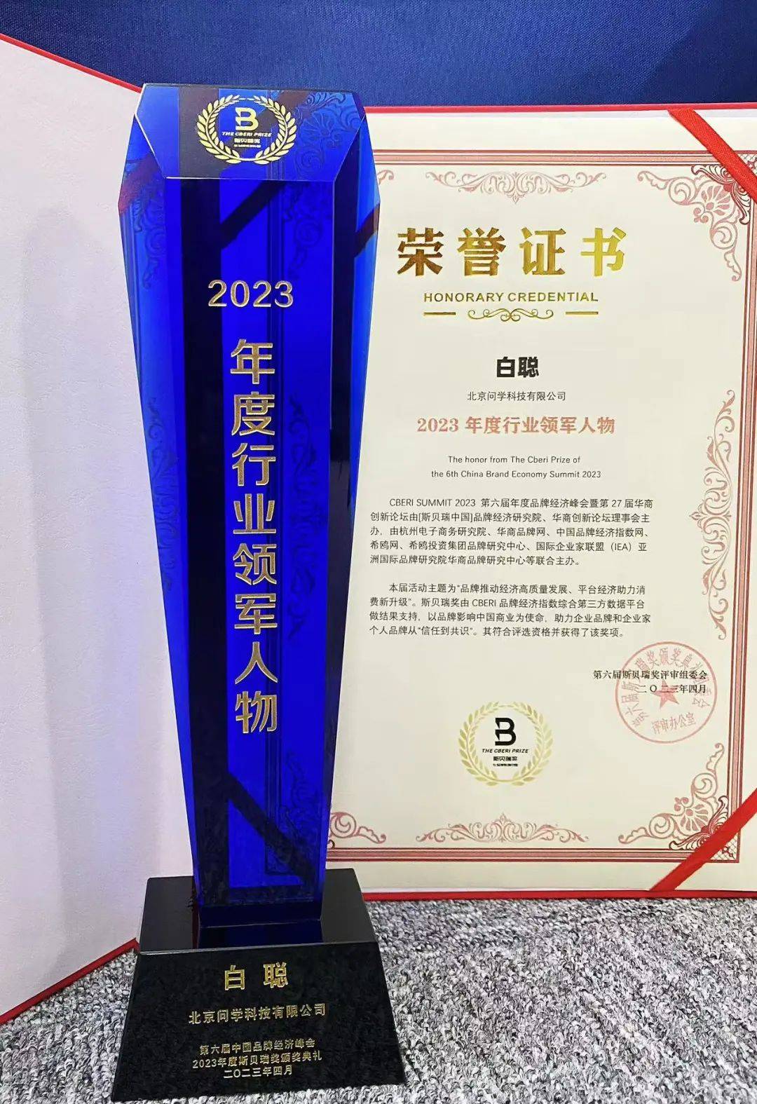 在此次盛会上,北京问学科技有限公司旗下的“高考圈”项目荣获了2023年度最具数字化品牌奖,同时公司的创始人白聪先生获得了2023年度行业领军人物奖。
