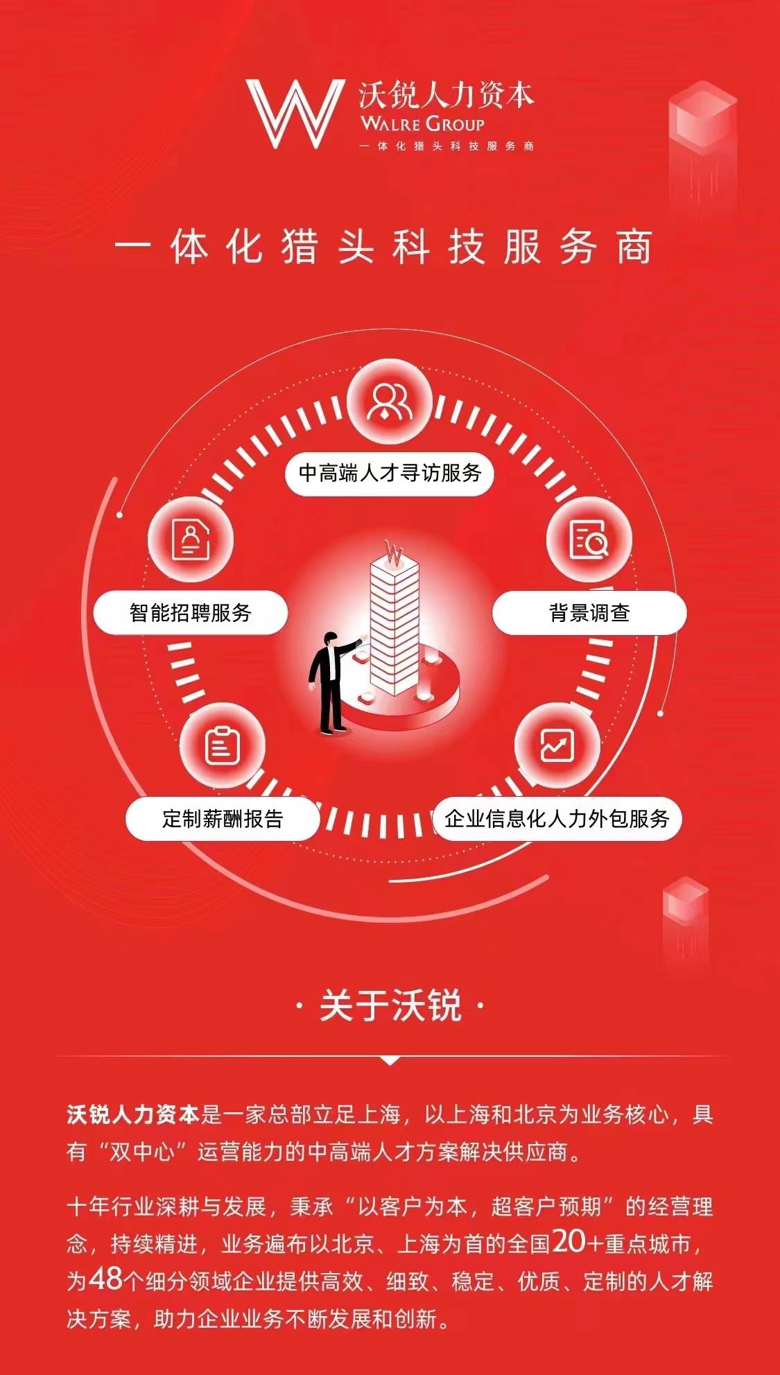 沃锐人力资本2008年3月成立于上海,是一家总部立足上海,以上海和北京为业务核心,具有“双中心”运营能力的中高端人才方案解决供应商。作为中国最早成立的知名猎头机构,以十五年行业深耕与发展,持续精进,业务遍布以北京、上海为首的全国20+重点城市, 为48个细分领域企业提供高效、精准、稳定、优质、定制的人才解决方案。