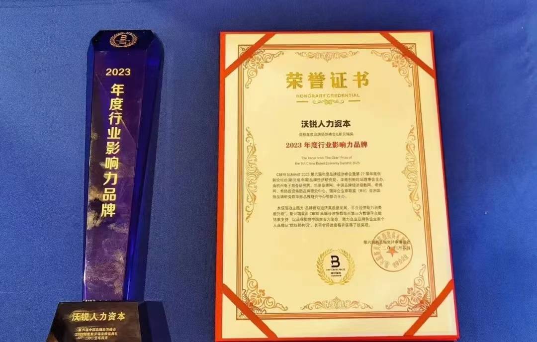 2023中国第六届品牌经济峰会暨第27届华商创新论坛以“品牌推动经济高质量发展、平台经济助力消费新升级”理念,并同步启动“2023年度斯贝瑞奖(THE CBERI PRIZE 2023)评选及颁奖典礼”系列品牌活动于杭州成功举办。沃锐人力资本荣获“斯贝瑞奖”2023年度行业影响力品牌。