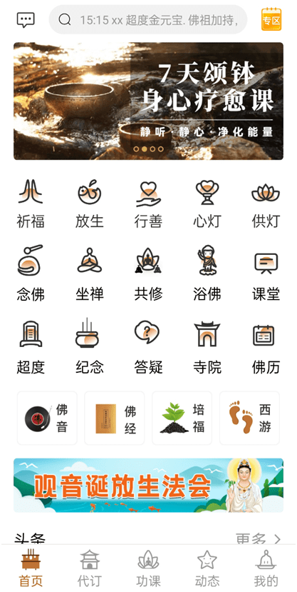 首页上整整齐齐排列了各种功能,诸如祈福、放生、供灯。他点开了祈福,梵音阵阵,释迦牟尼佛陀庄严立于佛堂。佛号声声,恭敬心一下子就生起来了。老刘说这个APP还可以线上浴佛,坐禅,他的同修都在用这个APP。我有些惊讶,原来可以这么方便了。“我一下子也介绍不完,你自己下载一个,回家可以仔细研究一下。”老刘依旧微笑着说。互相留下联系方式后,我们就各自回家了。后来慢慢用的过程中,发现不少功能确实很实用。比如: