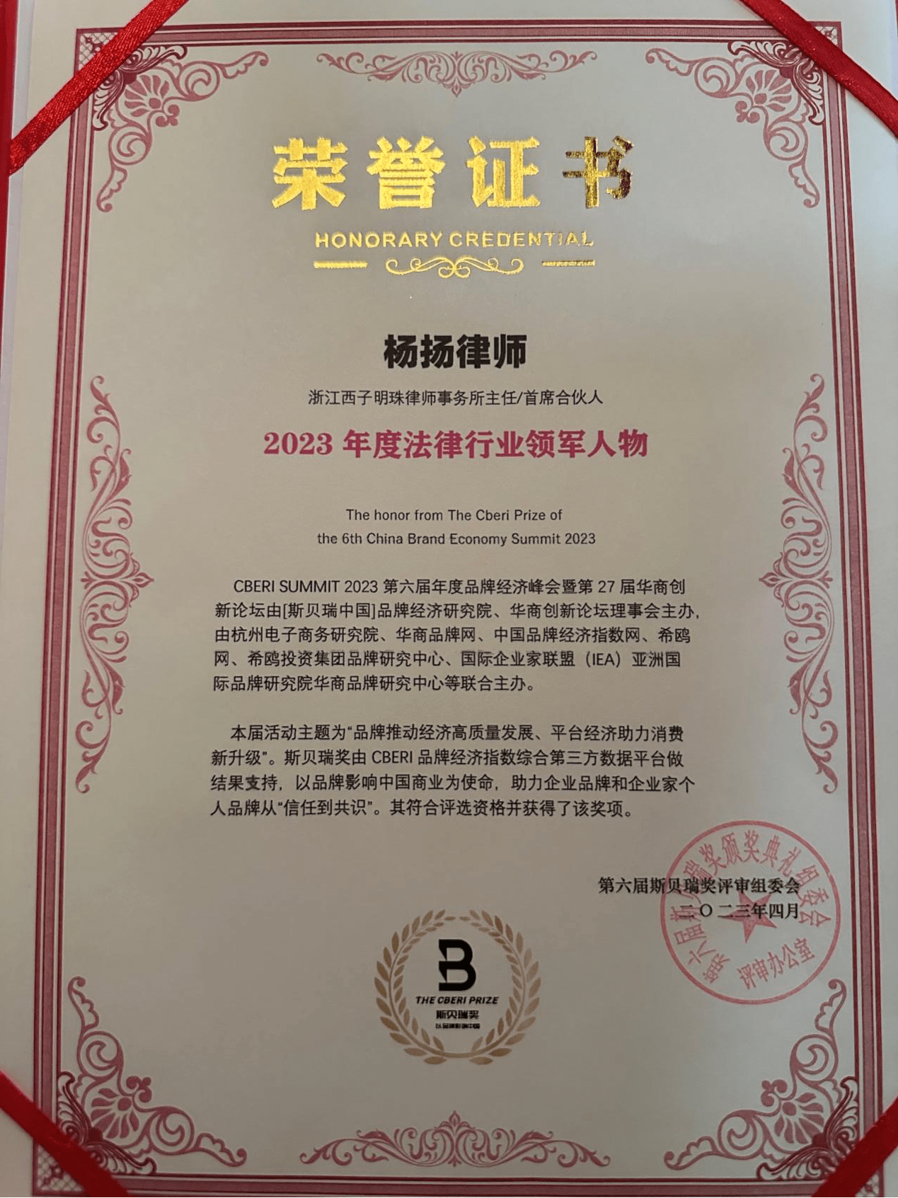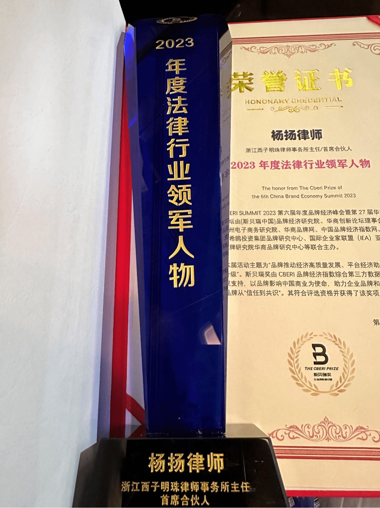 在晚上第27届华商创新论坛“杭州之夜”VIP交流活动开始之前,本次峰会还在现场揭晓了2023年度斯贝瑞奖评选结果。其中,浙江西子明珠律师事务所主任、首席合伙人杨扬律师荣获了2023年度法律行业领军人物。