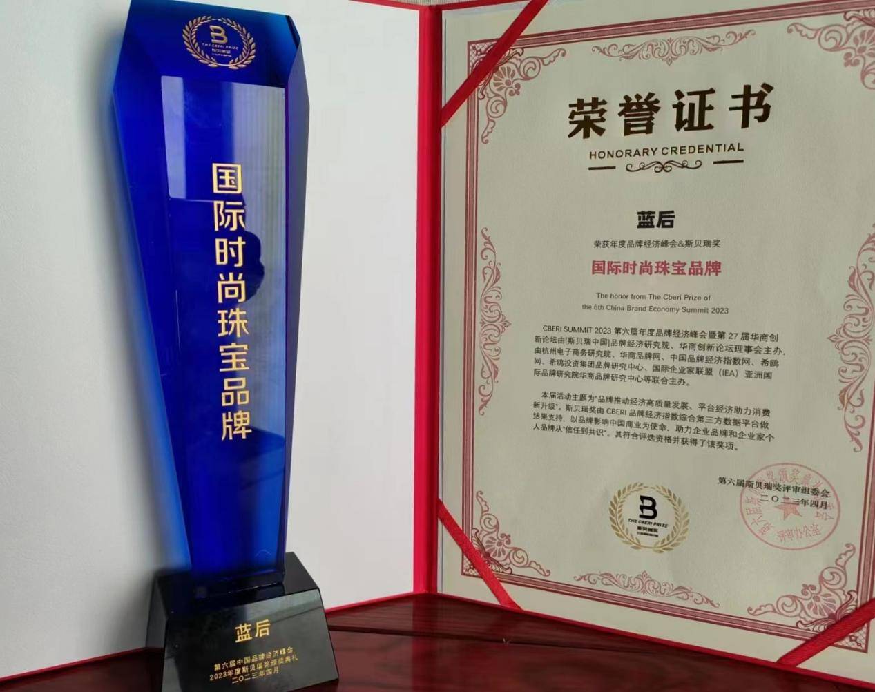 在晚上第27届华商创新论坛“杭州之夜”VIP交流活动开始之前,本次峰会还在现场揭晓了2023年度斯贝瑞奖评选结果。其中,蓝后珠宝 荣获了 国际时尚珠宝品牌。
