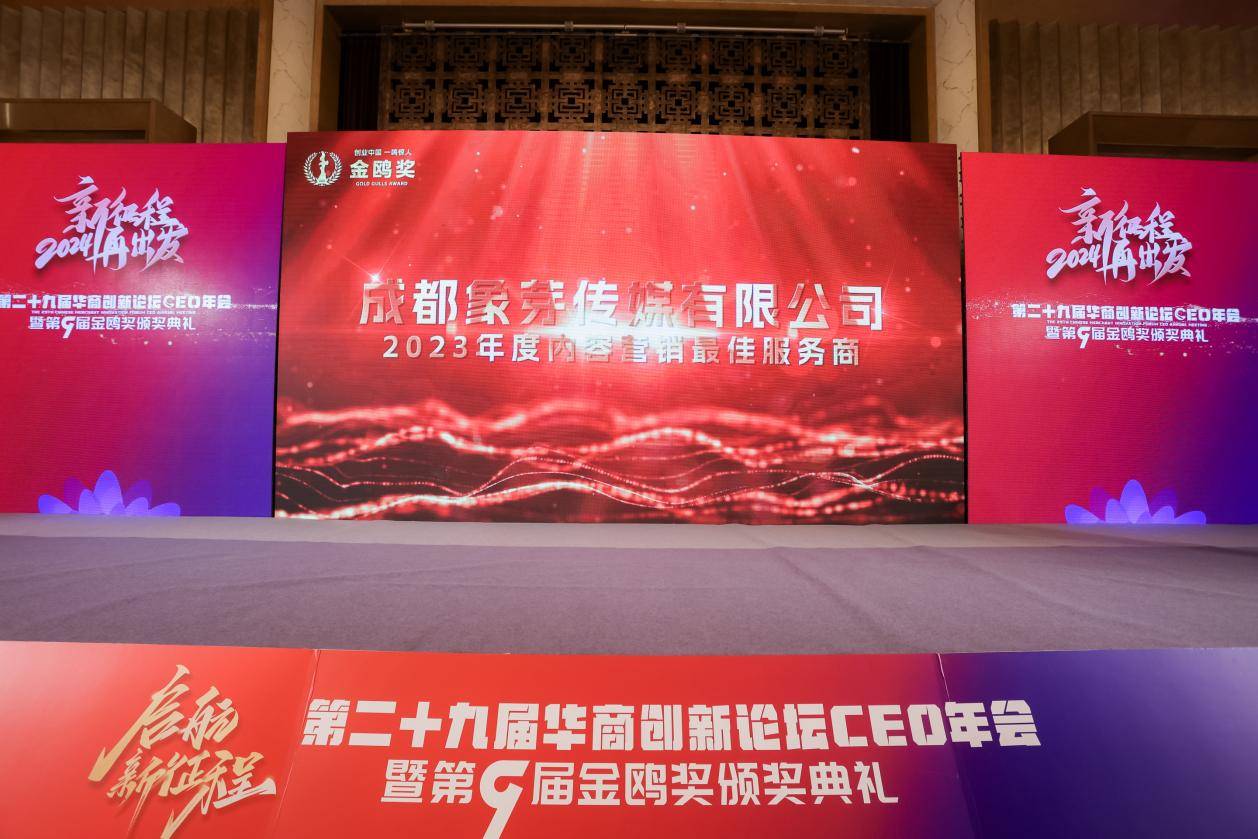 活动的最后环节,揭晓第九届金鸥奖评选结果。金鸥奖始于2016年1月,寓意“创业中国,一鸣惊人”,响应国家“助力经济高质量发展”的号召,旨在挖掘年度创新创业代表项目、人物,激励行业创新者、领跑者。自2016年1月6日起,每年举办一届。候选项目主要由机构推荐和项目自荐,分项目评审、主评委审核、奖项公示、颁奖典礼等阶段,本次共有2000个候选项目(人)提交资料角逐奖项。CPE源峰执行总经理徐巍、品牌专家张珊珊、分众传媒副总裁刘珊等作为金鸥奖评委,曾揭晓发布金鸥奖五大评选标准,即候选项目(人)的创新性和独特性;商业经营模式或获客模式与可持续性;市场竞争能力;客户价值的创造力及平台生态组织能力;品牌声誉和认知度。本届金鸥奖,知名企业家、慧聪集团创始人郭凡生获评年度创业人物最具成就奖,希音电商、傅利叶智能等获评年度最具市场价值未上市企业奖,汤臣倍健、诺特兰德等获评2023年度大健康产业数字营销增长力品牌。获奖代表依次上台领奖。最后主持人宣布,成都象芽传媒有限公司获评第九届金鸥奖2023年度内容营销最佳服务商奖项。