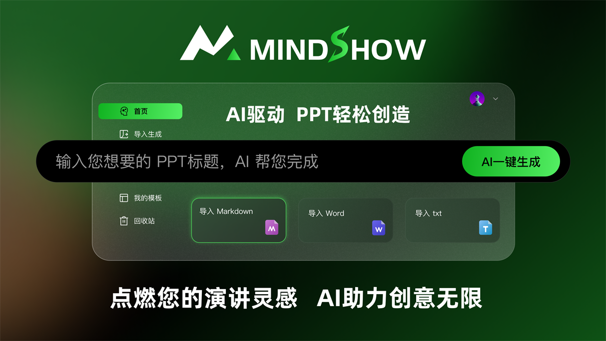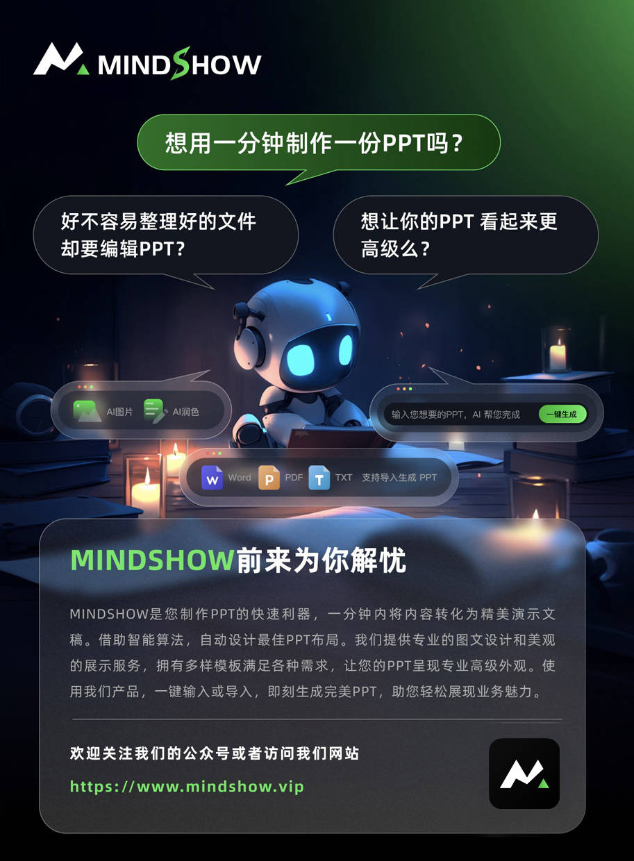 MINDSHOW.VIP作为爱客易智能科技旗下的一款AI办公SAAS产品,专注于办公领域,利用其引领前沿的人工智能技术,为用户打造智能办公体验。该产品能够自动识别用户的演示内容,并根据用户的需求提供相应的设计模板和排版建议,大大提高了办公效率和演示质量。随着人工智能技术的不断发展和应用场景的不断拓展,MINDSHOW.VIP致力于成为更加全面、多元化的AI办公工具。通过不断创新和改进,MINDSHOW.VIP将为用户带来更高效、智能、便捷的办公体验,并为其提供有力的支持,提升沟通和展示的效果。产品简介MINDSHOW是一款AI驱动的PPT/幻灯片内容辅助生成工具,只需要输入标题或特定描述,即可自动生成包括标题、大纲、内容和配图的完整PPT。MINDSHOW利用生成式AI技术,能够快速生成符合要求的PPT,提高用户的工作效率。从此您在 PPT 制作过程中把无需把大量的精力都花在了调各种格式和外观部分,把核心时间用在创意生成,概念表达和观点输出。MINDSHOW让AIPPT的能力发挥到极致,真正体现人工智能赋能人类的使命。品牌故事在数字世界里,我们发现了互动性和创新的魔力。这是一个迷人的世界,它是由算法,思考,想象,和智能构建的。在这里,我们创造出一种基于人工智能的全新工具,它可以让我们的思想和灵感轻松地转化为震撼人心的演示。我们将这个工具命名为“MINDSHOW”——这是一个强大而直观的工具,它诞生于我们和您对创新的热爱和对技术的执着探索。MINDSHOW:一种全新的表达方式。我们相信,无论你所处的行业、职位或角色,你总有一些想法和创新需要表达,而我们的任务就是帮助你描绘出这些色彩斑斓的思考,赋予思想生动的形式。让我们去共享创新,去表达热情,去传递力量。