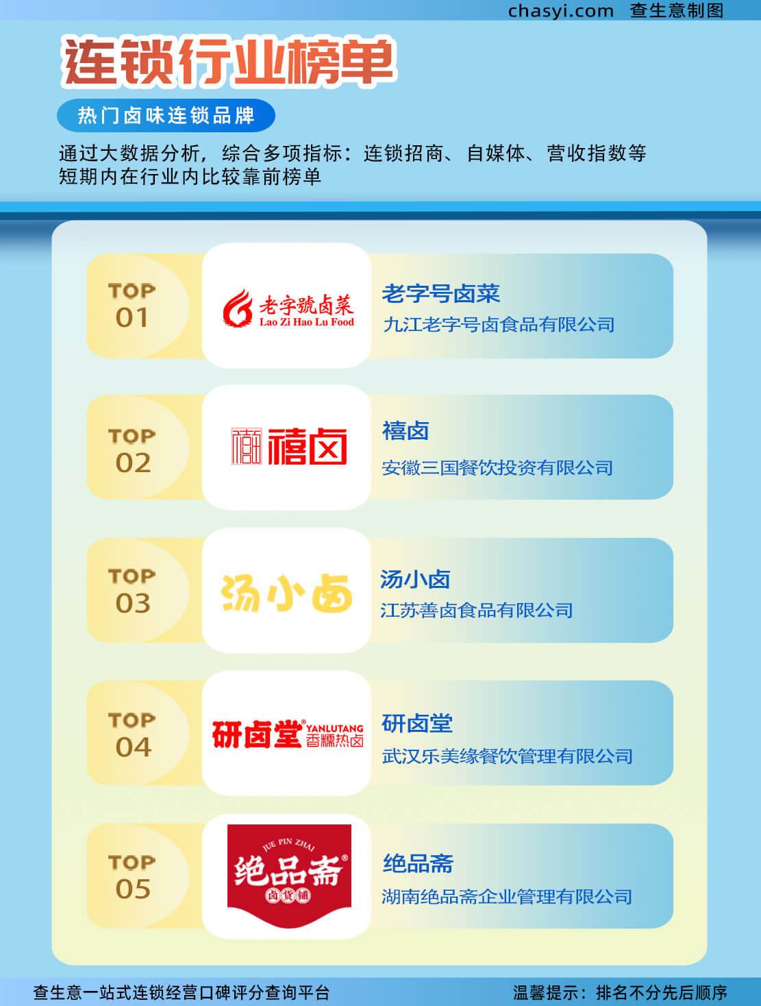近日,连锁行业榜单揭晓,其中热门卤味品牌以其独特的魅力,成为了市场的焦点。通过大数据分析,综合了连锁招商、自媒体影响力、营收指数等多项指标,评选出了一批在短期内表现突出的卤味连锁品牌。其中,老字号卤菜、禧卤、汤小卤、研卤堂和绝品斋,以其独特的经营模式和品牌影响力,成为了行业的佼佼者。