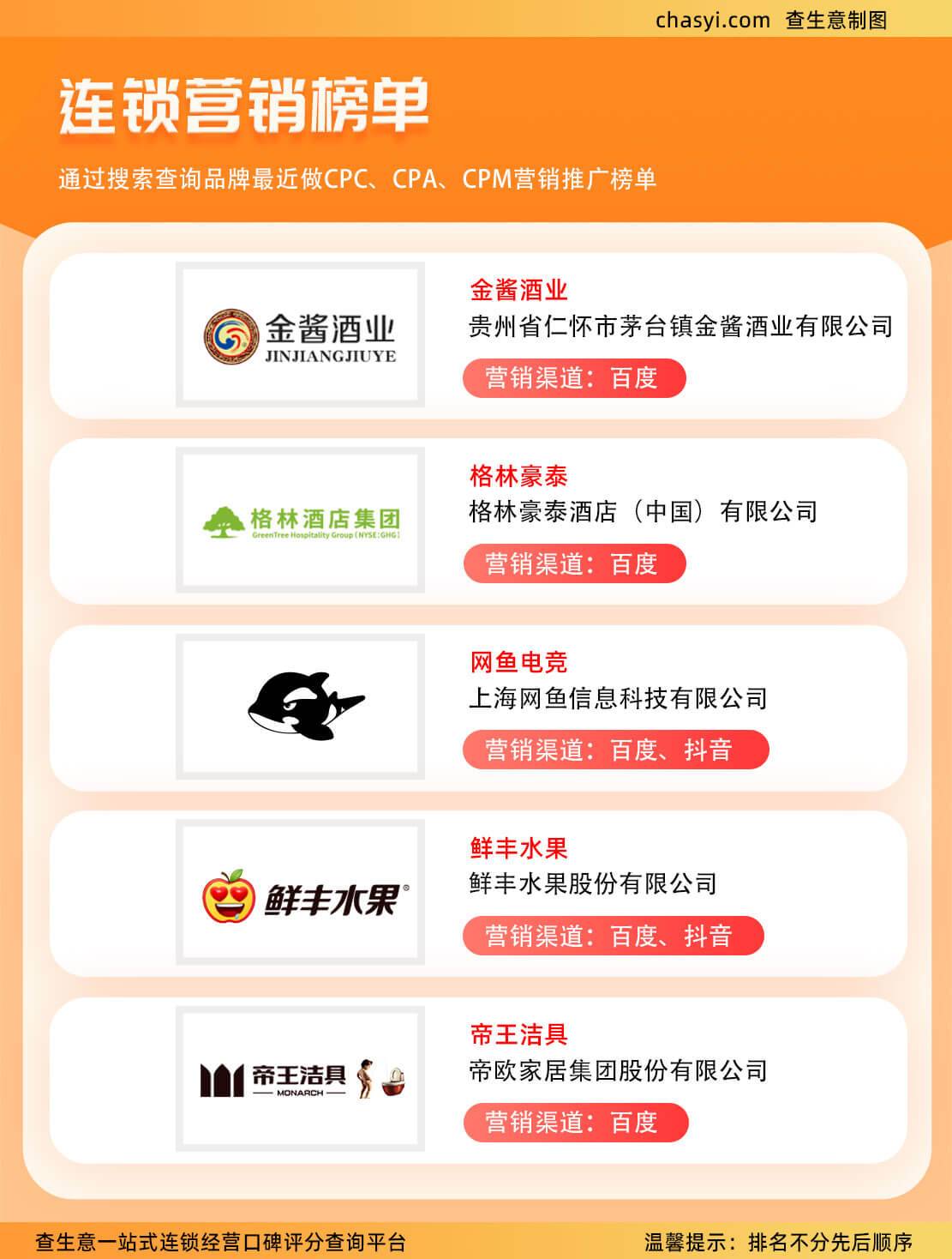 金酱酒业、格林豪泰、网鱼电竞、鲜丰水果以及帝王洁具这五家品牌,通过精准把握百度、抖音等主流营销渠道的特点与优势,实施差异化、整合性的营销策略,成功提升了品牌知名度、深化了消费者关系,从而在激烈的市场竞争中稳居连锁营销榜单前列,为其他连锁品牌提供了富有启示意义的营销实践案例。