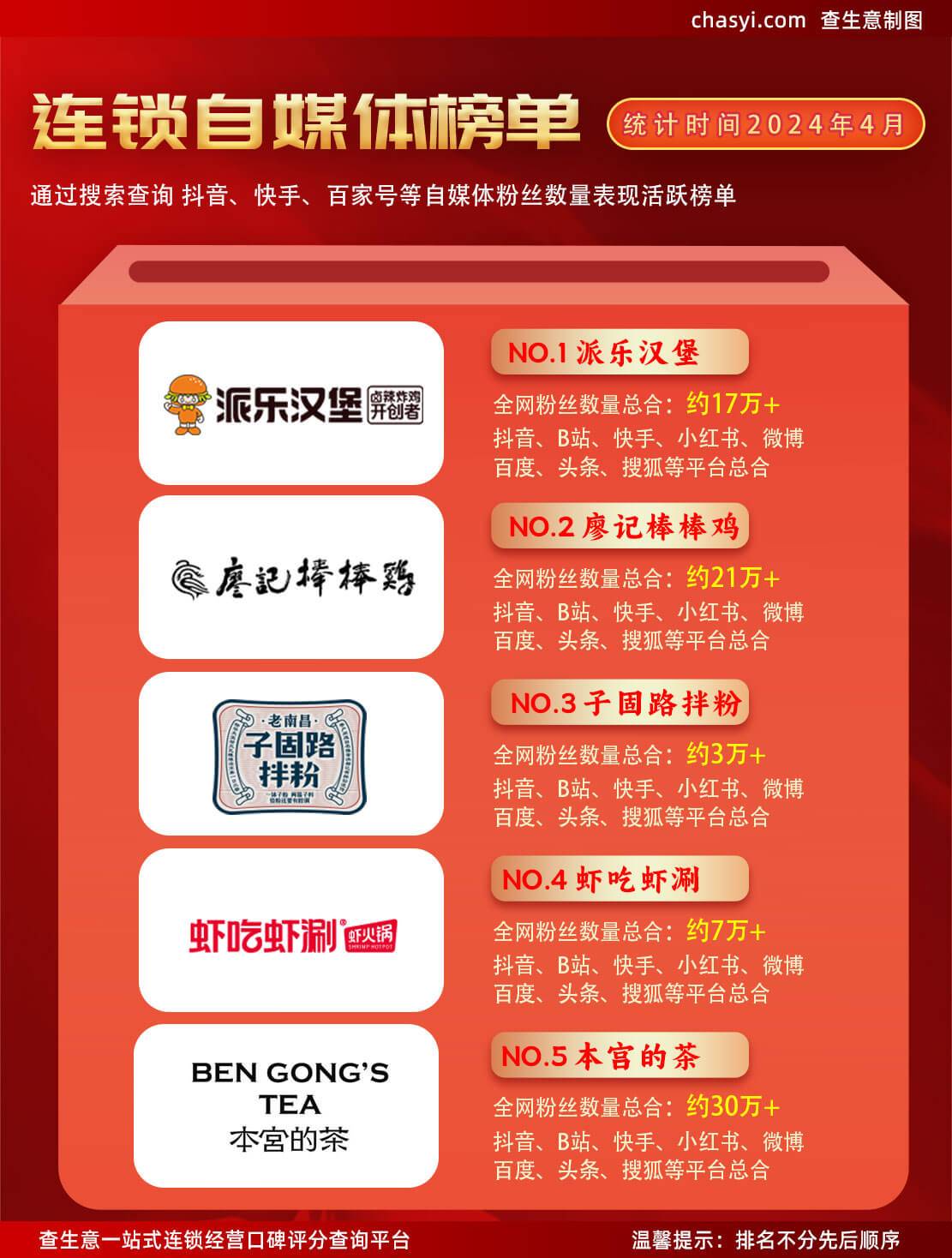 本次连锁自媒体榜单揭示了餐饮品牌在数字化营销中的多元路径与创新实践。派乐汉堡、廖记棒棒鸡、子固路拌粉、虾吃虾涮、本宫的茶等五大品牌凭借精准的内容策略、高效的互动手段与广泛的平台覆盖,成功构建起各自的自媒体影响力矩阵,为行业树立了数字化转型的新标杆。在未来,随着自媒体生态的持续演进,我们期待更多餐饮品牌能够乘风破浪,以优质内容与创新互动赢得消费者的青睐,书写属于自己的自媒体营销新篇章。