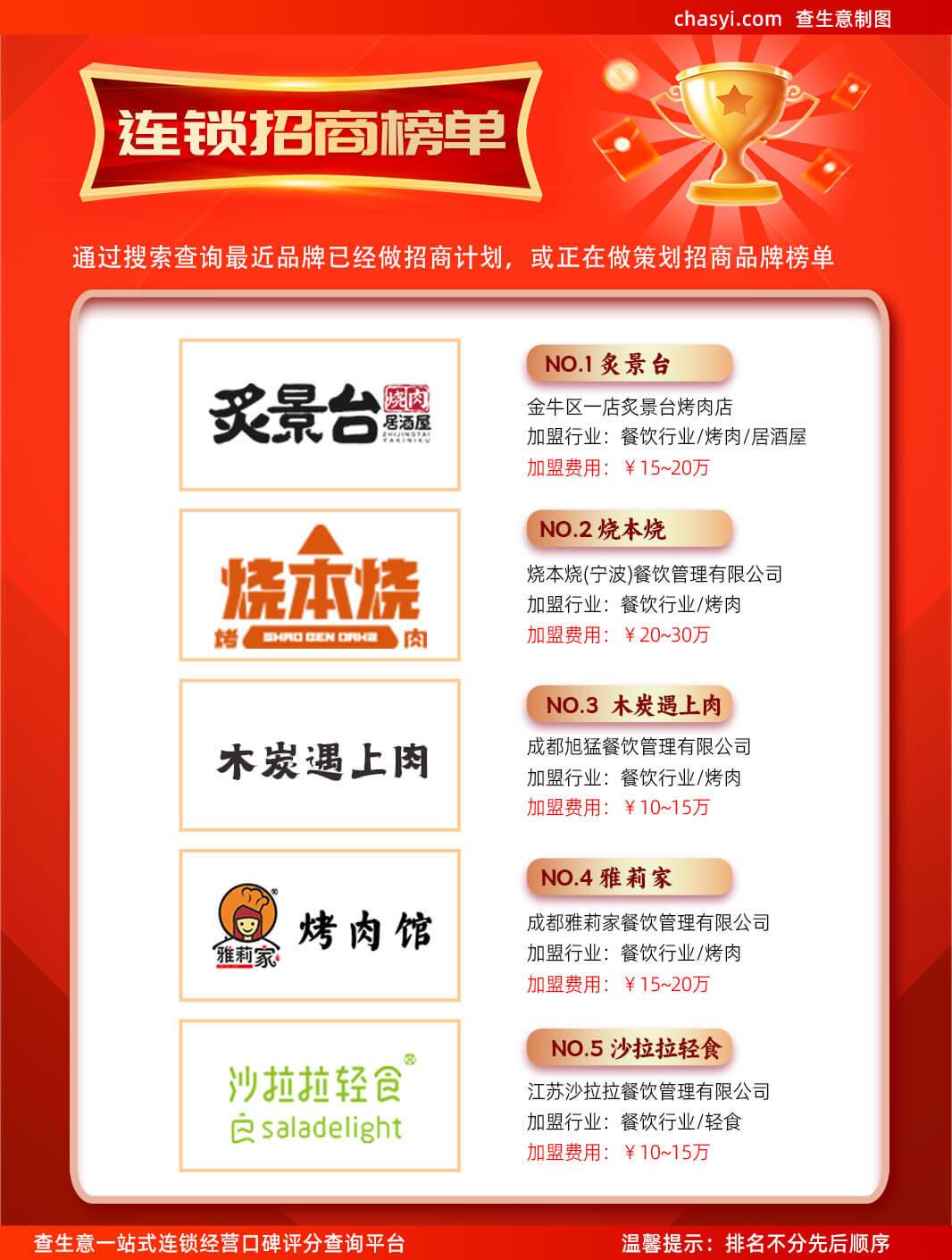 在当今的商业环境中,连锁招商已成为众多品牌迅速扩张、占领市场的重要手段。近日,一份备受瞩目的连锁招商榜单新鲜出炉,其中涵盖了多个在餐饮行业中表现亮眼的品牌。从烤肉到轻食,这些品牌以其独特的经营模式和卓越的市场表现,吸引了众多投资者的目光。
