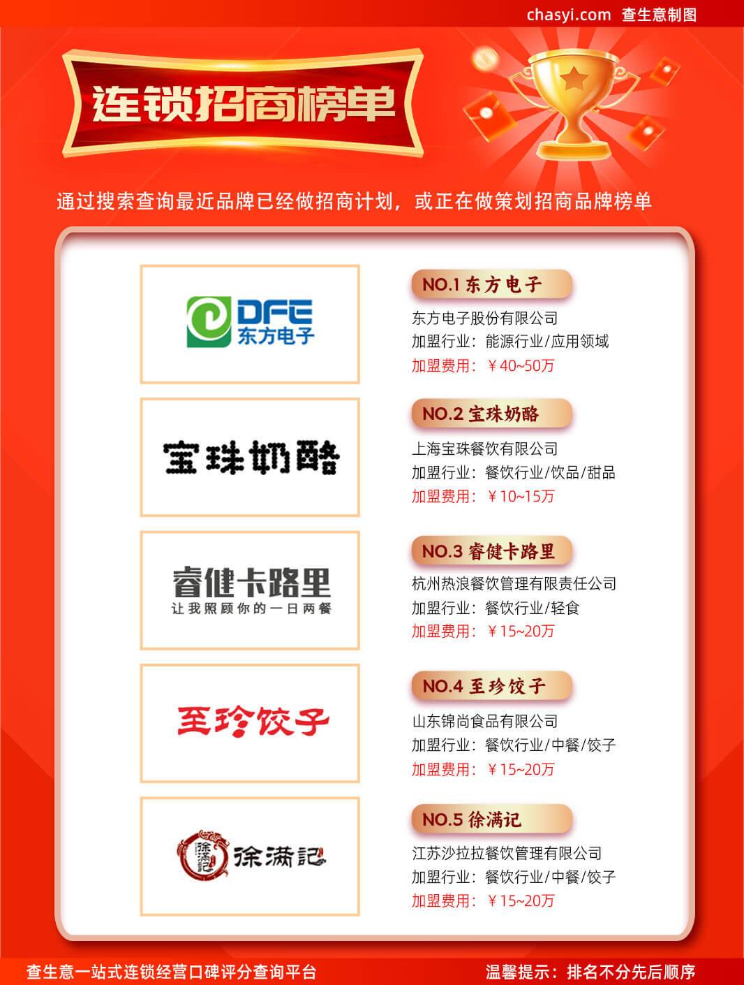 近年来,随着经济的发展和市场的繁荣,连锁招商成为了越来越多品牌扩张市场、提升品牌影响力的主要手段。最近,一份连锁招商榜单引起了广泛关注,其中东方电子、宝珠奶酪、睿健卡路里、至珍饺子和徐满记等五大品牌以其独特的商业模式和强大的品牌影响力,成为了招商市场的热门之选。