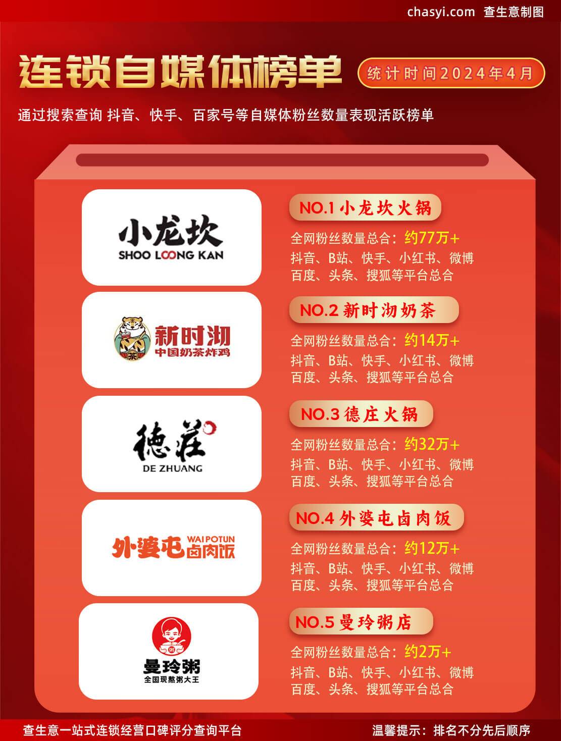 在数字化营销风潮席卷全球的当下,连锁餐饮品牌纷纷借助自媒体平台的力量,以独特的内容策略与互动方式,构建起与消费者紧密相连的网络生态系统。近日揭晓的2024年4月全网粉丝榜单,清晰勾勒出这一领域内五大品牌——小龙坎火锅、新时沏奶茶、德庄火锅、外婆屯卤肉饭以及曼玲粥店的卓越自媒体表现,揭示了他们在抖音、B站、快手、小红书、微博、百度、头条、搜狐等主流社交与内容平台上的强劲吸粉能力与广泛影响力。