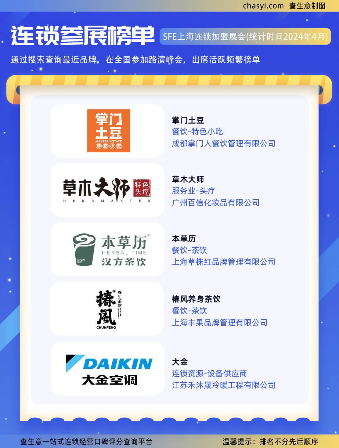 随着2024年SFE上海国际连锁加盟展览会的圆满落幕,一系列崭露头角的品牌以其独特的商业模式、强劲的发展势头及广泛的市场影响力,在全国路演峰会上展现出高度活跃的态势,成为连锁加盟领域的新焦点。以下五个代表性品牌——掌门土豆、草木大师、本草历、椿风养生茶饮以及大金空调,以其各自的行业定位与核心竞争力,生动诠释了现代连锁加盟行业的多元发展与创新活力。