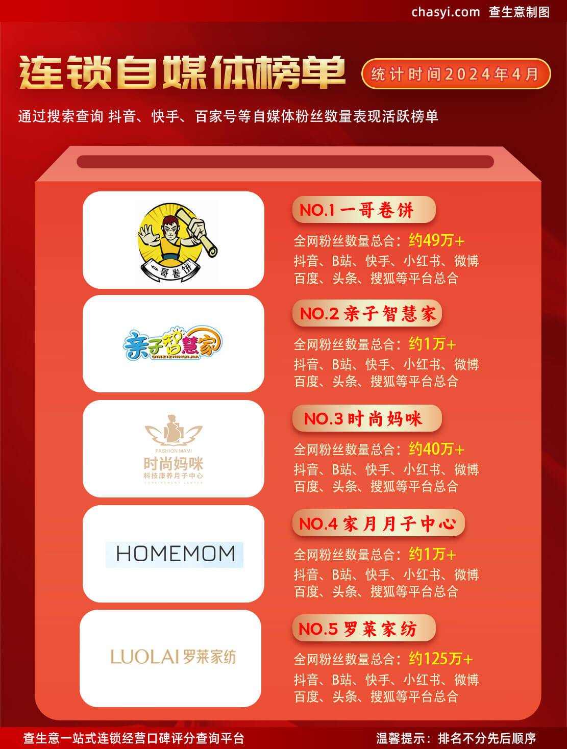 随着互联网生态的日益丰富,自媒体平台已成为品牌传播不可或缺的重要阵地。本月,最新公布的“连锁自媒体榜单”再度引爆业界关注,揭示了哪些品牌在抖音、快手、百家号等主流平台上凭借其独特魅力和创意内容成功吸粉无数。让我们一同聚焦本次榜单上的五大佼佼者——一哥卷饼、亲子智慧家、时尚妈咪、家月月子中心、罗莱家纺,看他们如何在自媒体江湖中独领风骚。