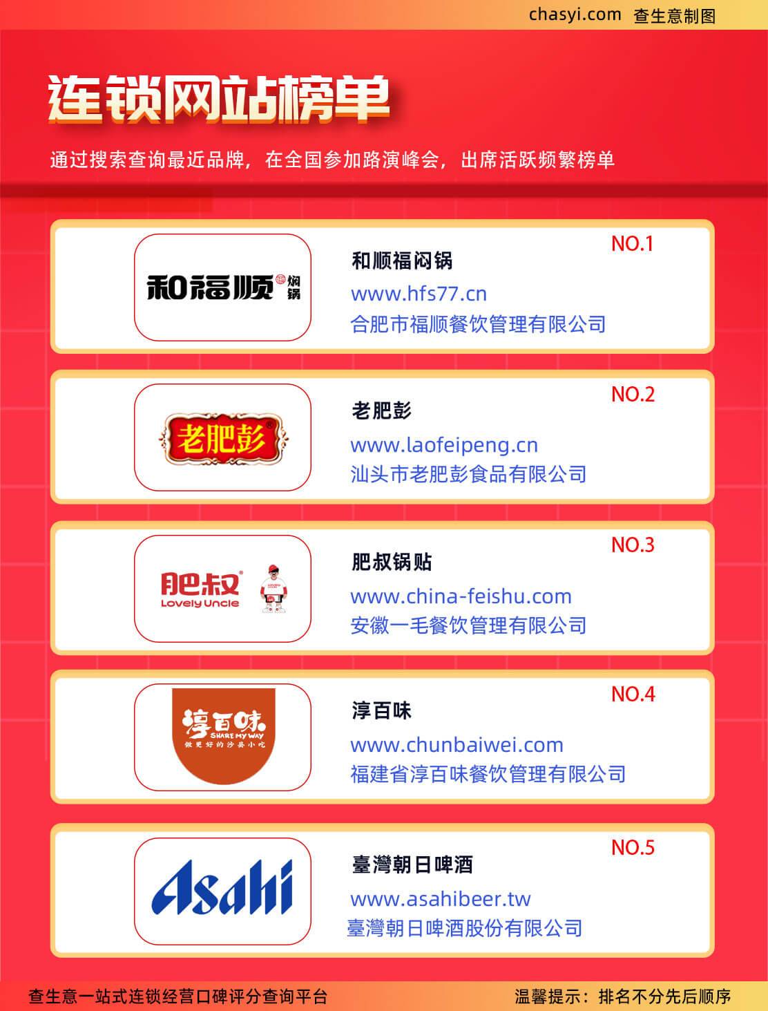在近日公布的连锁网站榜单中,五家品牌凭借其卓越的品牌影响力和活跃的市场表现,成功跻身前列。这些品牌分别是和顺福闷锅、老肥彭、肥叔锅贴、淳百味以及臺灣朝日啤酒。它们不仅在全国范围内展开了一系列精彩的路演峰会,还通过搜索查询和在线活跃度,展现了其强大的品牌实力和市场竞争力。