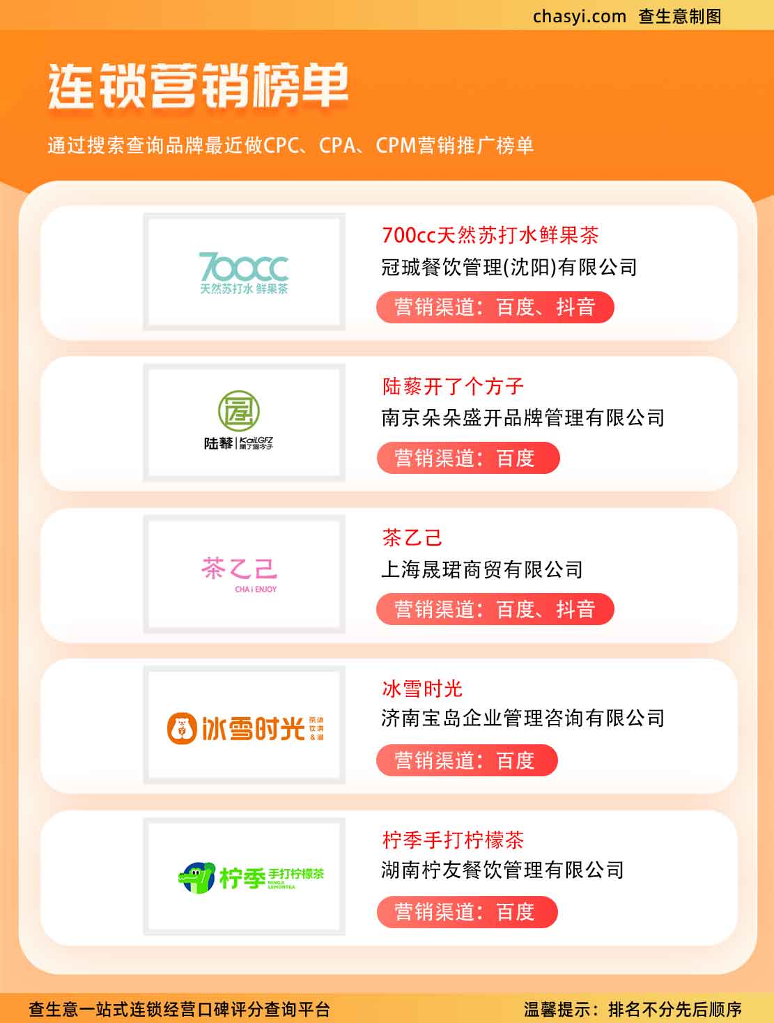在消费升级和数字营销浪潮的双重驱动下,连锁品牌间的竞争日益激烈,而营销策略的创新成为品牌脱颖而出的关键。近日,茶饮连锁品牌营销榜单新鲜出炉,其中,700cc鲜果茶与柠季手打柠檬茶凭借其独特的营销渠道布局,在众多品牌中尤为亮眼,不仅在百度、抖音等主流平台上大放异彩,更通过精准的市场定位和创意营销活动,成功捕获了广大消费者的芳心。