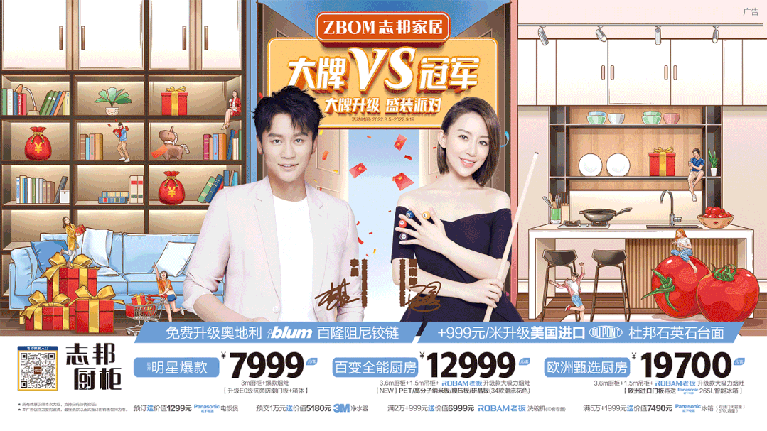 8月5日-9月19日活动之际,明星助阵,产品升级、高配俱全,大波优惠奔涌而来,全国各大志邦家居门店、志邦天猫官方旗舰店、志邦京东官方旗舰店同步开展让利活动,快带你身边的朋友一起来优选,错过此次,再等一年!更多福利,超多优惠