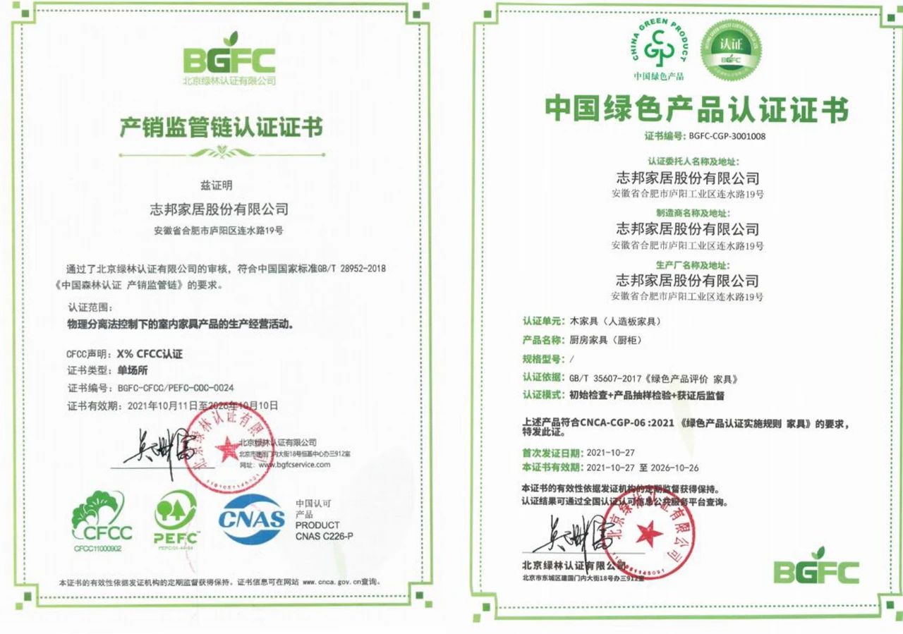 早在2008年,志邦产品就通过了中国环境标志认证——十环认证;2012年12月,志邦家居成立实验中心,目前可开展包括人造板、石材、五金、木质柜、厨房电器、包装材料等原材料和产品100多个检测项目;2021年10月,志邦家居荣获《产销监管链认证证书》、《中国绿色产品认证证书》;不久前,志邦家居还顺利通过全球最严苛FSC森林认证。