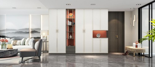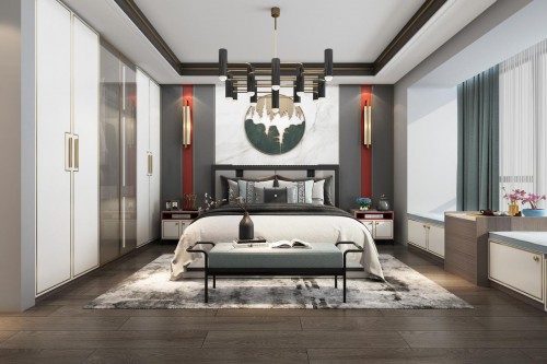 在具体的产品设计中,每一处手工打磨的东方韵味都值得推敲。衣柜门板镶嵌金属条,并在把手位置进行转折处理,使对开门的呈现横向的“中”字样式。置物器分门别类,加入融入嵌入式感应灯光,取放方便。金色沙纹玻璃与丰富的灯光相辅相成,使柜内结构若隐若现,富有朦胧感。中式飘窗吸取中式传统卧榻设计灵感,在满足收纳需求的同时也不失优雅品味。