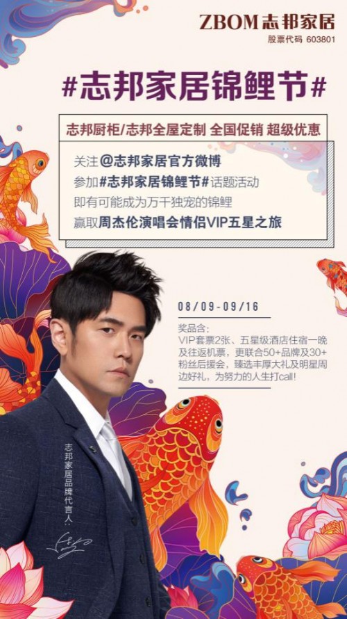 8月9日至31日,不仅线下门店门庭若市,微博上的志邦家居锦鲤节活动也热力爆棚!网友们可以通过关注@志邦家居官方微博转发锦鲤节活动微博参与到活动中,赢取志邦家居锦鲤大奖——周杰伦演唱会情侣VIP套票。不仅如此,志邦家居还为获奖锦鲤承包往来交通和五星级酒店住宿费,堪称史上最贴心的品牌。