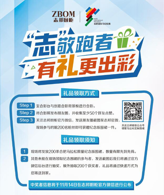 三、参与“志敬跑者,有礼更出彩”活动,与志邦颁奖台合影,发布朋友圈积50够个赞,就能领取马拉松限量定制围裙一件。