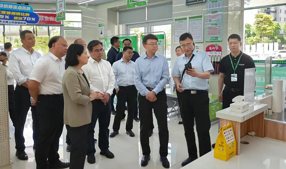 (江西省人民政府史可副省长(右一)一行莅临益丰大药房考察,宜春市医疗保障局叶坤副局长(左一)讲解)