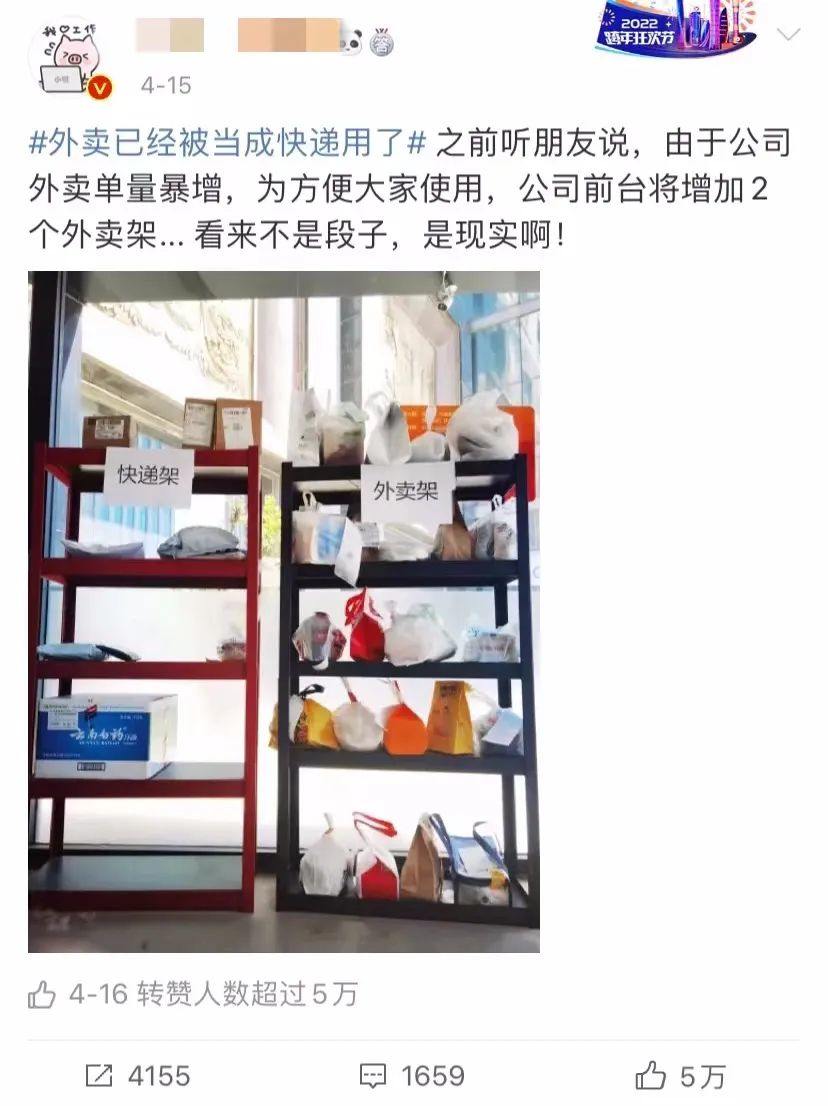 疫情反复,#外卖已经被当成快递用了#话题,在4月冲上微博热搜榜。