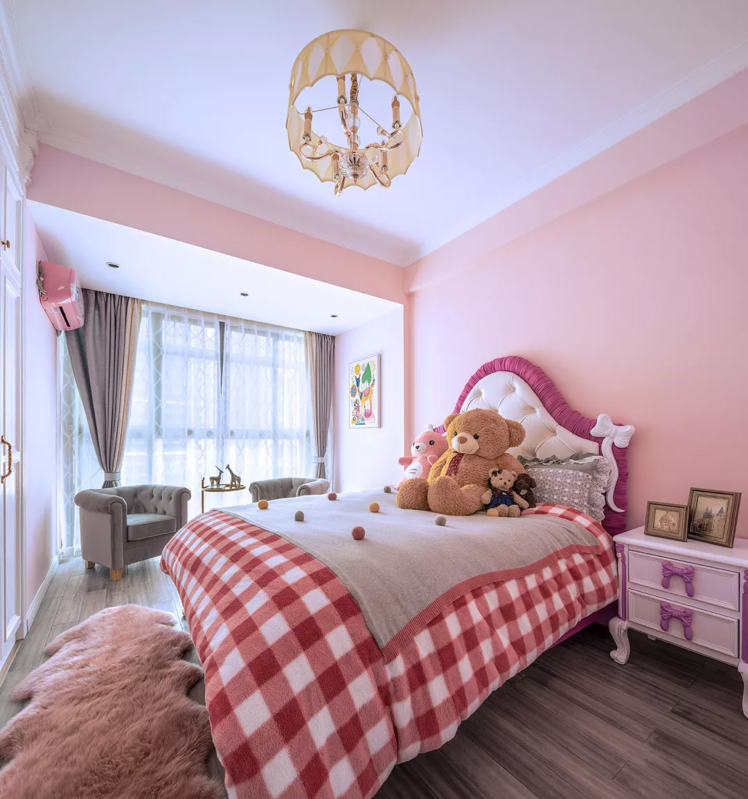 ▲儿童房以公主范的粉色调为主,皮艺床以粉色靠背与床单布置,床尾地面还有一张粉色毛毯,浪漫可爱的空间,充满了舒适的童趣感。