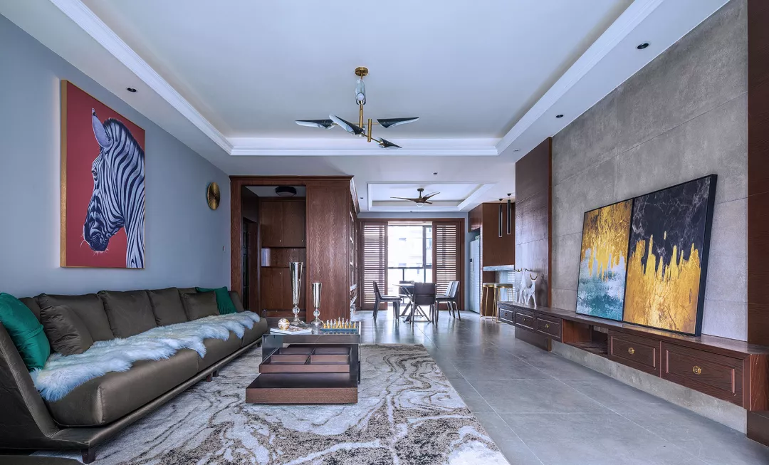 这是一套160平米的现代混搭风格装修房子,整体以深色为主色调,搭配硅藻泥、艺术漆装饰,让空间充满稳重端庄的气质,舒适现代感软装搭配,营造出一种轻奢高冷的华丽感。| 客厅 |