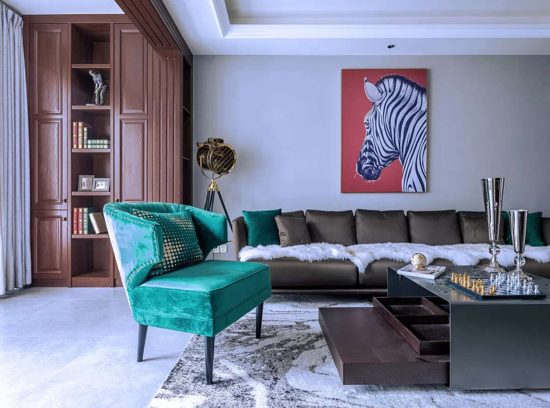 ▲香槟绿色的皮沙发,沙发墙一幅红色背景的斑马挂画,结合轻奢范的沙发椅与茶几布置,让客厅充满了华丽端庄的气质。