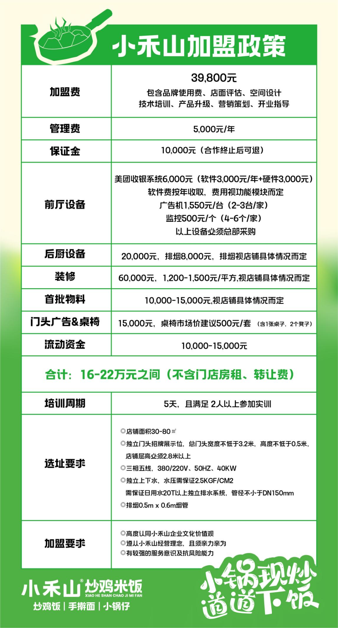 小禾山炒鸡米饭是来自中国杭州的中式快简餐品牌,以鲜鸡现炒为主打,兼顾快餐的速度与简餐的品质,开拓炒鸡快简餐新模式,让中国快餐走向世界。第一家小禾山门店于2020年10月5日于杭州新加坡科技园开业。2020年-2023年,三年时间,小禾山先后开设10家直营店,经过不断探索完善,最终标准输出万店模型。小禾山·炒鸡米饭以“小锅现炒,道道下饭”的品牌理念、以及原材料的跨品类使用和采购价优势,保证出品标准化和高效出餐,力求做到好吃不贵经济实惠的平民价格,真正实现“让你我他吃得更幸福”的品牌使命。