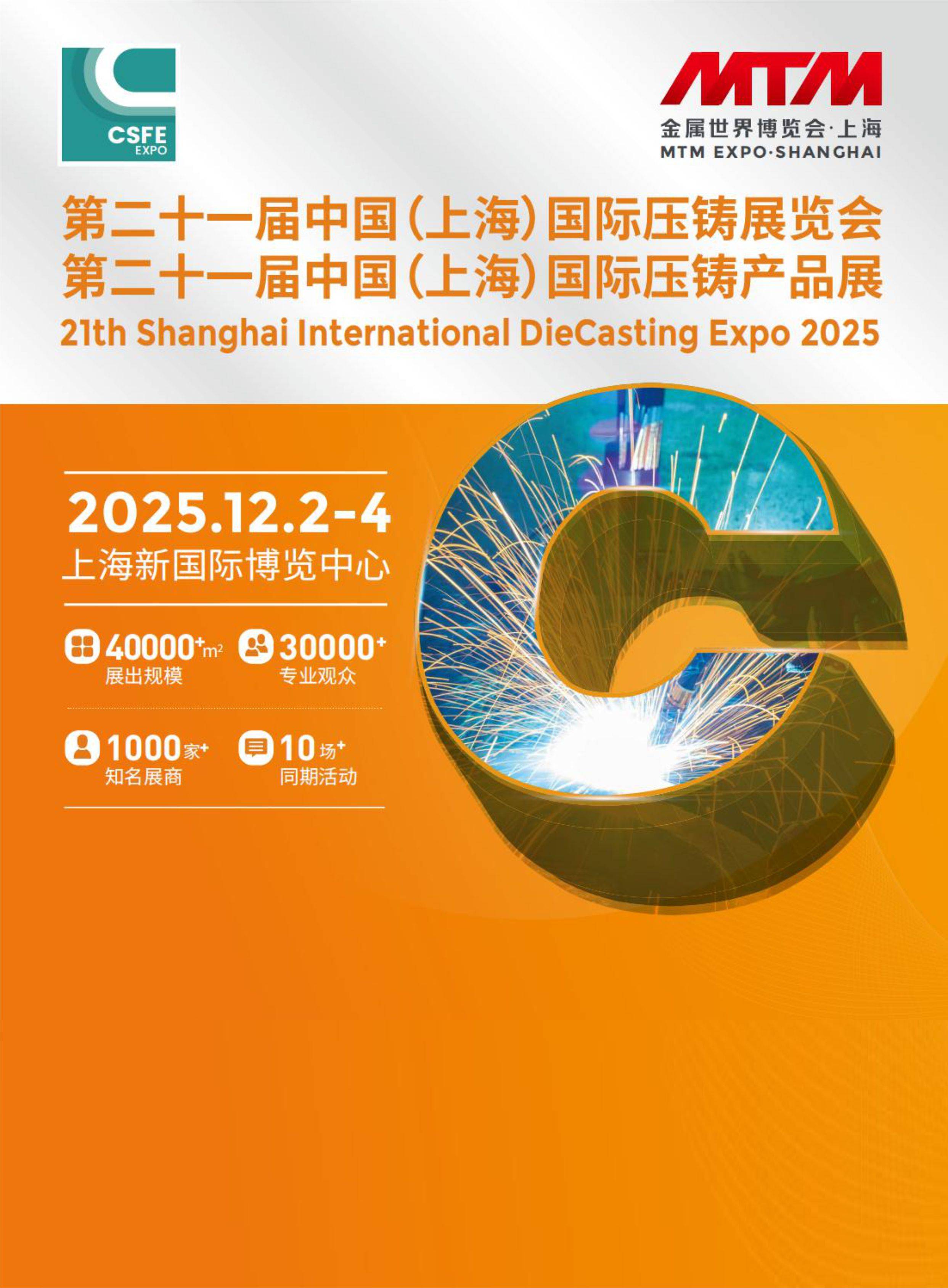 第二十一届中国(上海)国际压铸、铸件展览会将于2025年12月2日-4日在上海新国际博览中心隆重召开,届时预计1000家压铸、铸造及相关企业齐聚,展览面积40000平方米,超过30000名专业观众。本届展会将以“国际化、专业化、高层次”的要求,邀请中国和世界压铸厂家展示新产品、新技术、新设备,从而帮助业界高层全面了解全球压铸产业链的最新趋势,同时为观众打造产品、材料和设备的一站式采购平台!