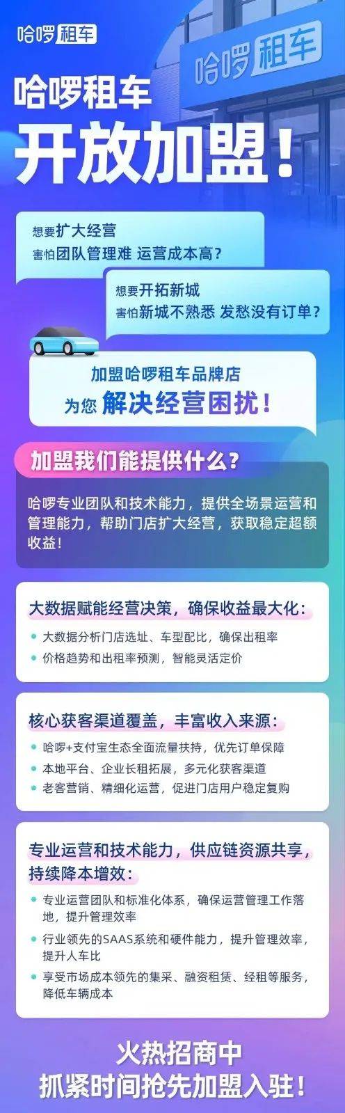 哈啰租车是为用户提供自驾租车服务的聚合出行平台,拥有7000 +车型的20W +的在线车辆,在全国390 +座城市设立了10W +的服务网点。自2021年成立以来,哈啰租车一直秉承“以用户为中心”的价值观和服务理念,以全场景的出行服务与信用生活生态赋能租车业务,从出行场景出发推动国内市场的规范化、流程化与标准化。哈啰租车一直以务实的态度、优质的服务、优惠的价格、方便快捷的订取车流程,应用数字技术红利,为人们提供更便捷的出行,以及更好的普惠生活服务。