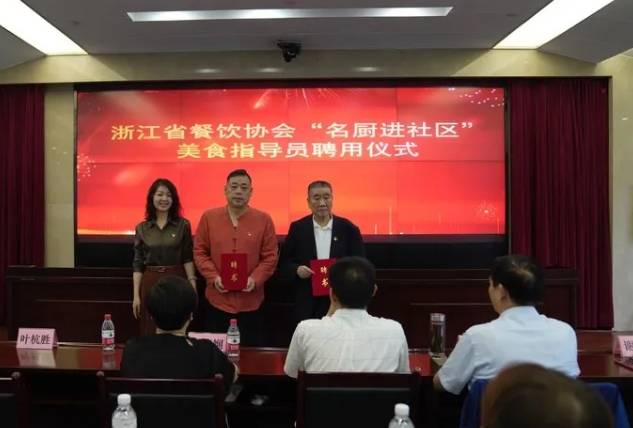 6月25日上午,在浙江经贸大楼六楼,中国烹饪大师、省餐饮行业协会民间菜专委会主任叶杭胜,省餐饮行业协会副会长、浙菜厨艺大师、“美食达人”宋小军受聘为皇亲苑社区“美食指导员”。