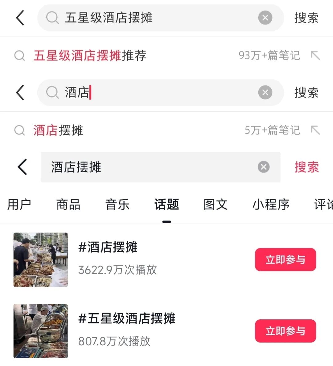 最近,“星级酒店摆摊”的话题刷屏了社交网络。截至7月7日,小红书上关于“酒店摆摊”“五星级酒店摆摊”等相关笔记数已超过百万。而在抖音上,关联“酒店摆摊”的相关视频播放量也突破3千万。
