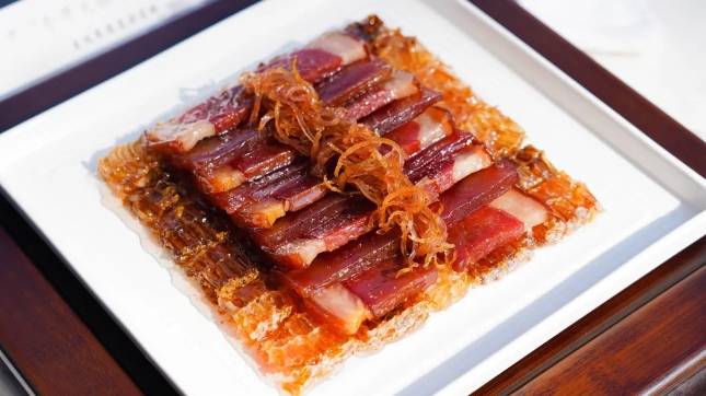 蜜汁火方选用的是金华火腿的上方,其历史可追溯至清代美食家袁枚《随园食单》:“取好火腿,连皮切大方块,用蜜酒煨极烂最佳……其香隔户便至,甘鲜异常,以后不能再遇此尤物矣。”