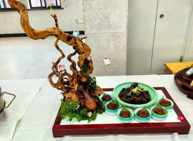 本次实操技能竞赛时间为 150分钟,为了公平公正,在端到裁判室之前,由专门的工作人员进行作品换号。考评员从装盘外形、色泽、火候质地、口味、卫生等方面对选手进行评分。