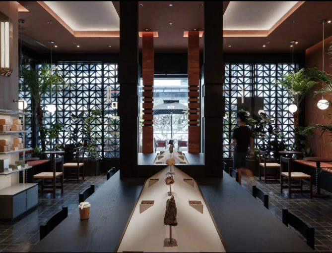 而PRO店则更强调“风土溯源”理念。如新开的华南首家PRO店,整体采用20世纪40年代西非“热带现代主义”风格,细节处处体现咖啡文化:以“产地石”呈现原产地风貌,以“追山羊”浮雕石致敬咖啡起源传说,辅以天然洞石与火山岩,强化咖啡冲煮的仪式感,让消费者沉浸于咖啡背后的故事之中。