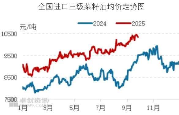 2025年9月,国内进口菜籽油现货价格整体呈震荡上行态势,月度均价环比上涨。截至9月28日,各地区进口三级菜籽油现货均价为10199元/吨,较上月上涨265元/吨,涨幅2.67%。