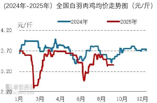 整月价格走势呈现“跌—涨—稳”特征:月初因市场需求疲软,企业收购意愿下降,叠加鸡源略增,导致鸡价回落;中旬前期价格触底后,伴随需求回暖及屠宰利润回升,企业采购积极性增强,推动价格反弹;下半月鸡源供应稳定,供需趋于平衡,价格维持横盘,例如山东地区社会鸡报价稳定在3.35元/斤,持续近半个月。