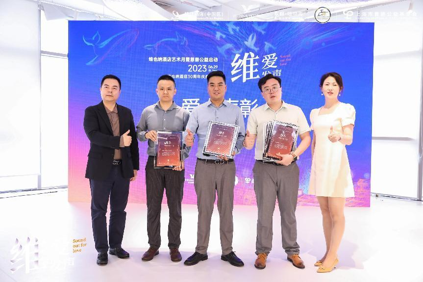 活动现场,锦江酒店(中国区)上海总部运营中台负责人陈勇(下图左1)、锦江酒店(中国区)副总裁维也纳酒店&欧暇·地中海品牌总裁张敏(下图右1),为爱心人士代表颁发“维爱发声”项目公益联合推广大使证书。