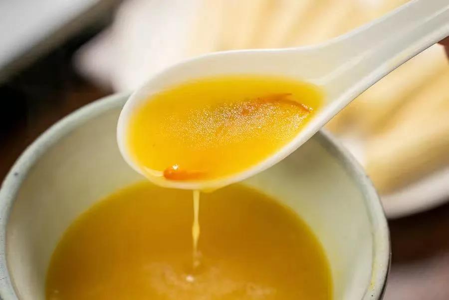 吃锅圈花胶鸡锅底还得讲究顺序! 要先品尝一碗精华凝聚而成的浓汤 瓷白的碗里好像盛入了“黄金” 鲜甜绵滑的口感能一次性喝三碗!