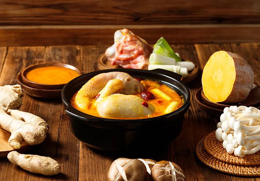 为了最大程度呈现花胶鸡锅底的美味 锅圈选用三黄鸡作为原料整只细熬 它肉质细嫩,口味更佳