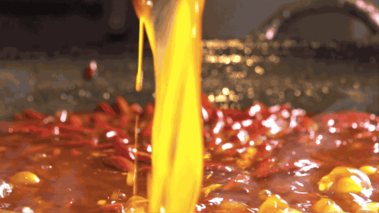 迫不及待放入毛肚涮一下,等它吸满汤汁,入口先尝到的是辣,接着花椒的麻袭来,整个过程不抢毛肚的原味。咀嚼时口腔的味蕾被彻底唤醒,辣、麻劲中,慢慢回味锅底的香,味道纯正得好几次都让我以为我是在重庆! 老师傅把控炒制 小方砖在锅圈商城月销60000包,它的受欢迎程度可见一斑。相比其他锅底,小方砖会有点辣,因为它还原了重庆地道火锅味。