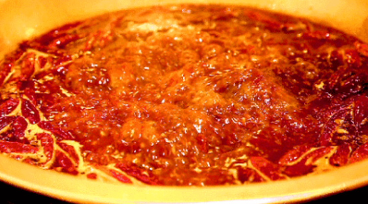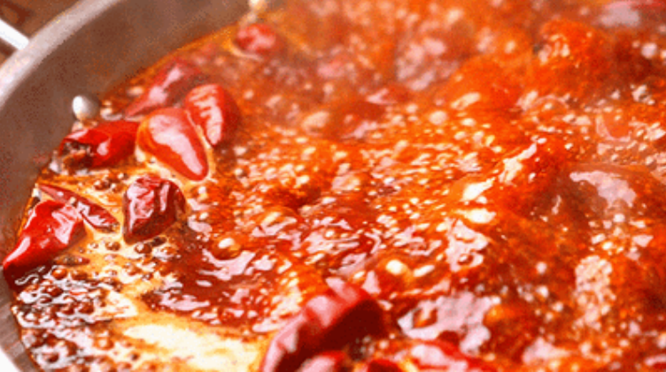 整锅锅底鲜艳油亮,咕噜咕噜冒着红色的泡泡,看着非常诱人。