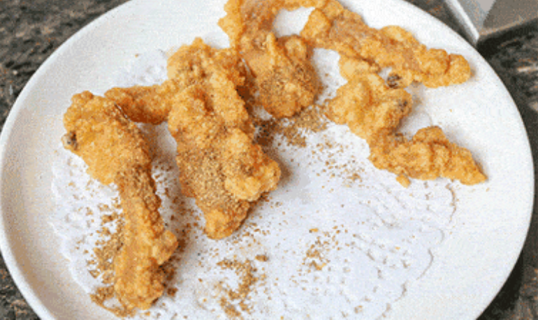 接着用鲜鸡蛋和红薯粉等食材调制面糊,给肉条裹上一层“外衣”后,放入热油预炸。