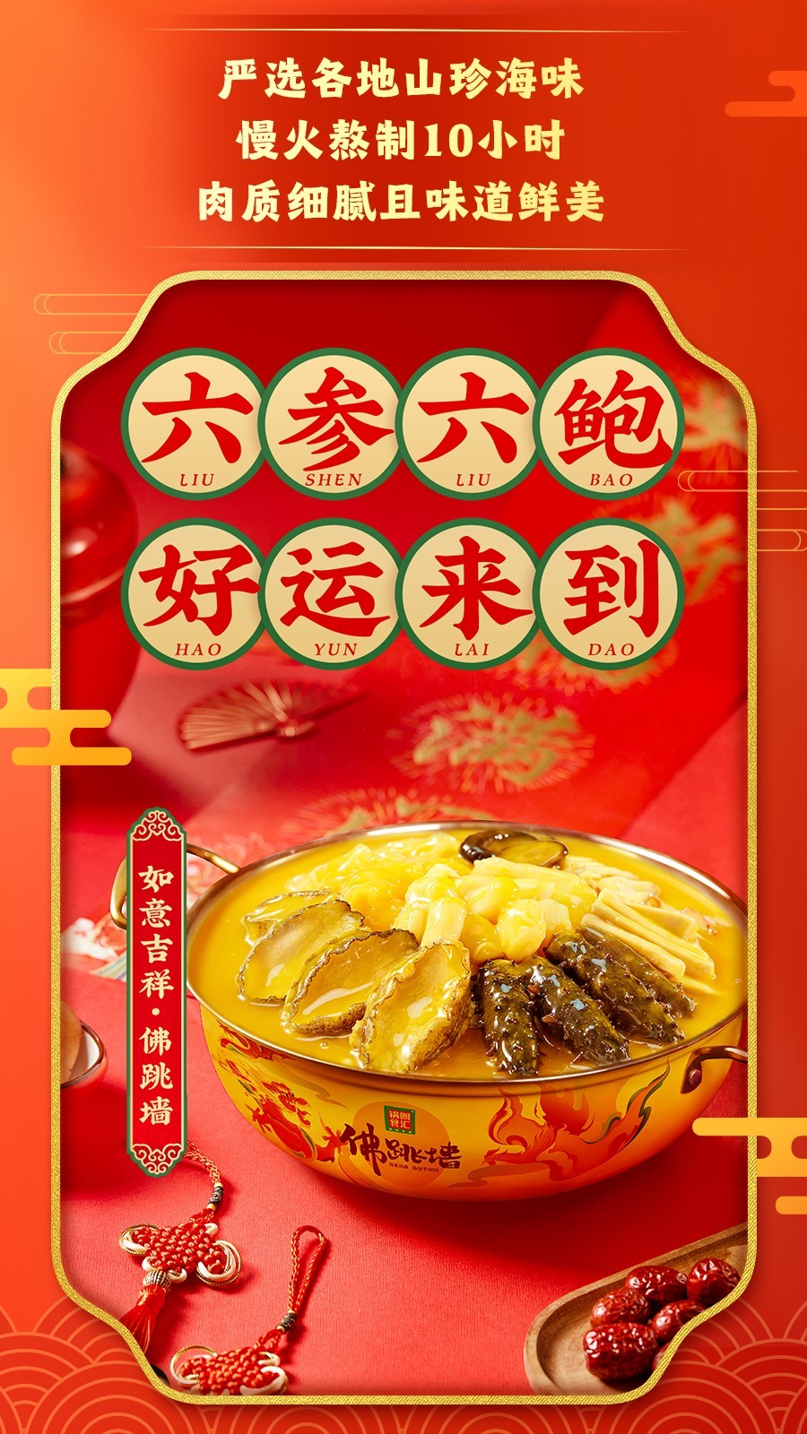 锅圈年夜饭必吃榜一:福寿双全--佛跳墙!相传,该菜品由清道光年间的福州聚春园菜馆研制,有人品尝后触发诗兴:“坛启荤香飘四邻,佛闻弃禅跳墙来”。锅圈将佛跳墙品质升级,菜中六参六鲍,被誉为海洋“软黄金”,肉质细嫩、营养丰富,其美味久久怀念!