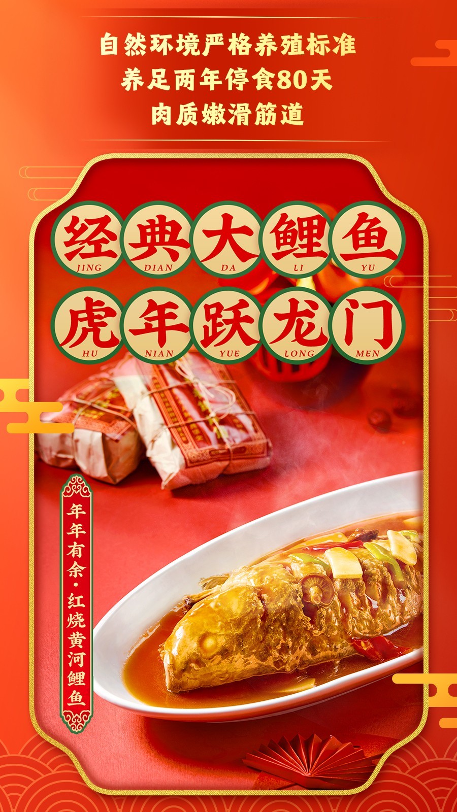 锅圈年夜饭必吃榜二:年年有余--红烧黄河鲤鱼!正所谓“宴必有鲤”,而黄河有“铜头铁尾豆腐腰”之说,河南恰处于“腰”上,此段所产黄河鲤鱼品质尤佳。而锅圈选用的“黄河金生态鲤鱼”,所用鲤鱼养殖在无污染的黄河沙滤活水,以豆浆喂养,骨酥肉嫩,回味绵长!